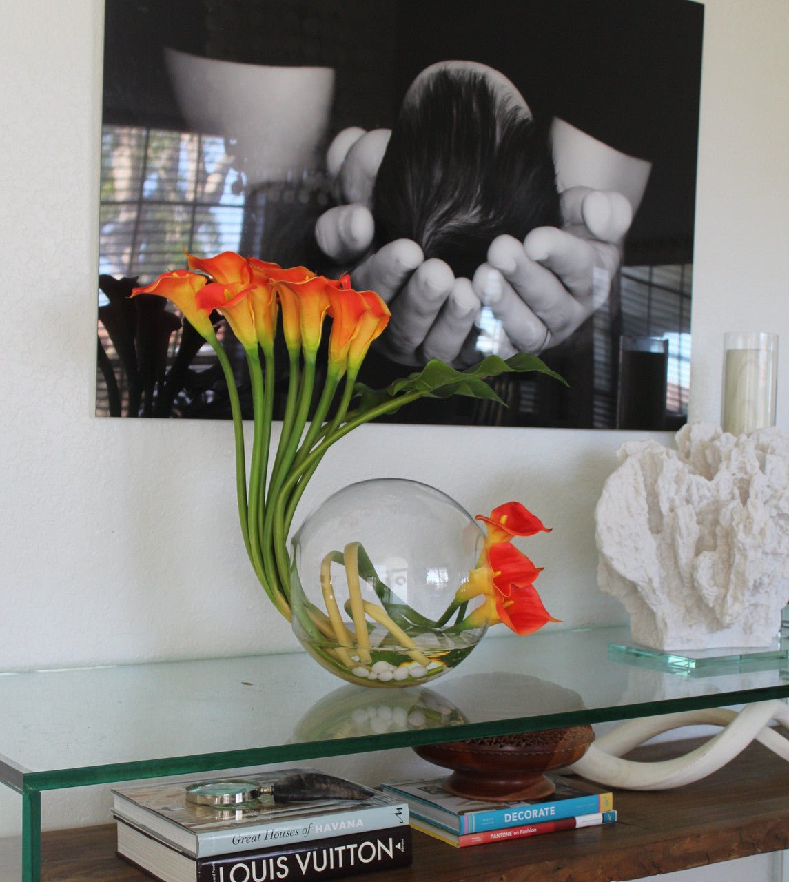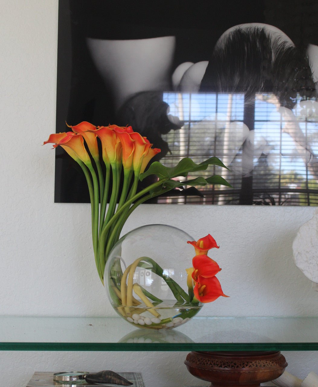 Crosswinds vase 12″ x 11″ with beautifully arched mango calla lilies and leaves. white stones and our illusion water.
