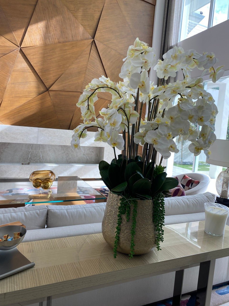 Often called the moth orchid. the Phalaenopsisis a favorite among our designers for its dense leaves. elegantly arching sprays. and lovely white blooms. Our remarkably lifelike arrangement is staked into a moss-covered Delany textured gold pot.Exceptional craftsmanship is presented at spectacular scale in this gorgeous white Phalaenopsis arrangement. showcased the Delany Pot which is cast from aluminum. then polished and electro-plated for a textured gold finish and simple silhouette. It’s designed for drama and destined to get attention: Display it on your dining room tabletop. or let this Phalaenopsis orchid make a great first impression in the foyer.