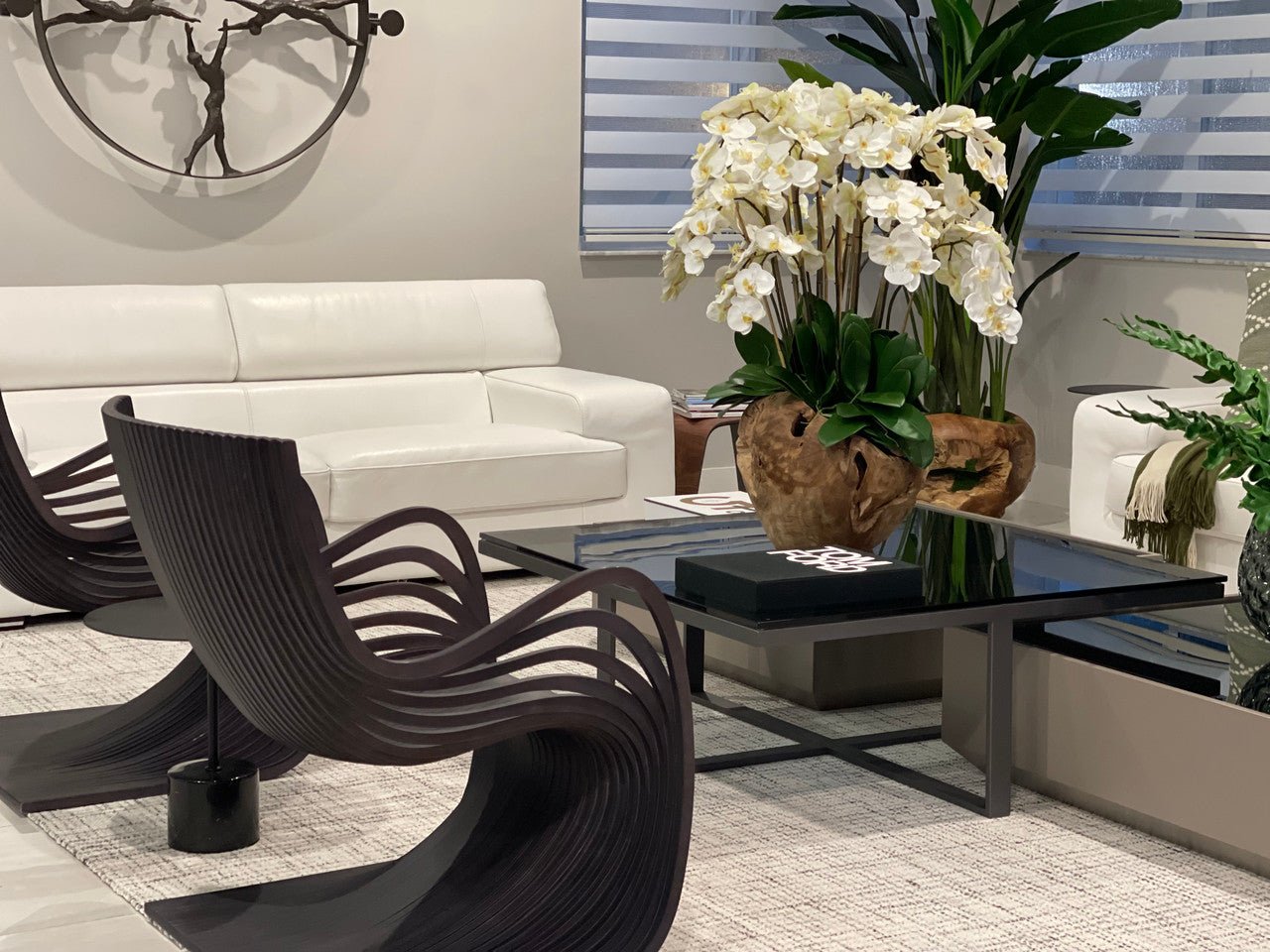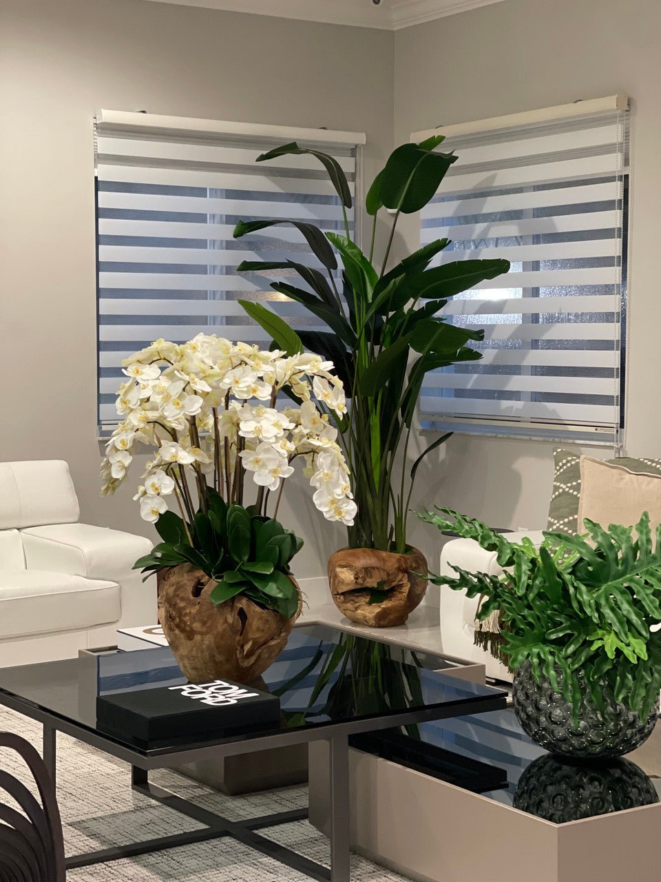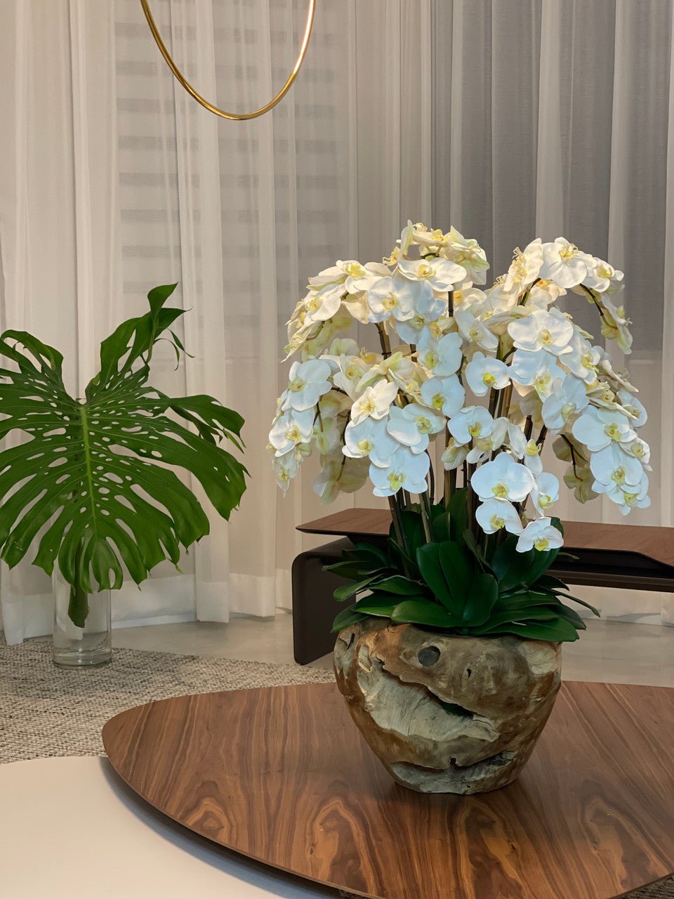 The timeless beauty and elegance of white orchids. paired with a unique one of kind hand made teak bowl from Indonesia. Each bowl has natural imperfections that add to the uniqueness and beauty of the arrangement. Give your space an impressive finishing touch with this Real Touch Phalaenopsisorchid arrangement. Presented in an elegant teak bowl. these natural-looking orchids provide an opportunity to enjoy the presence of fresh orchids all year-round without the hassle of watering.