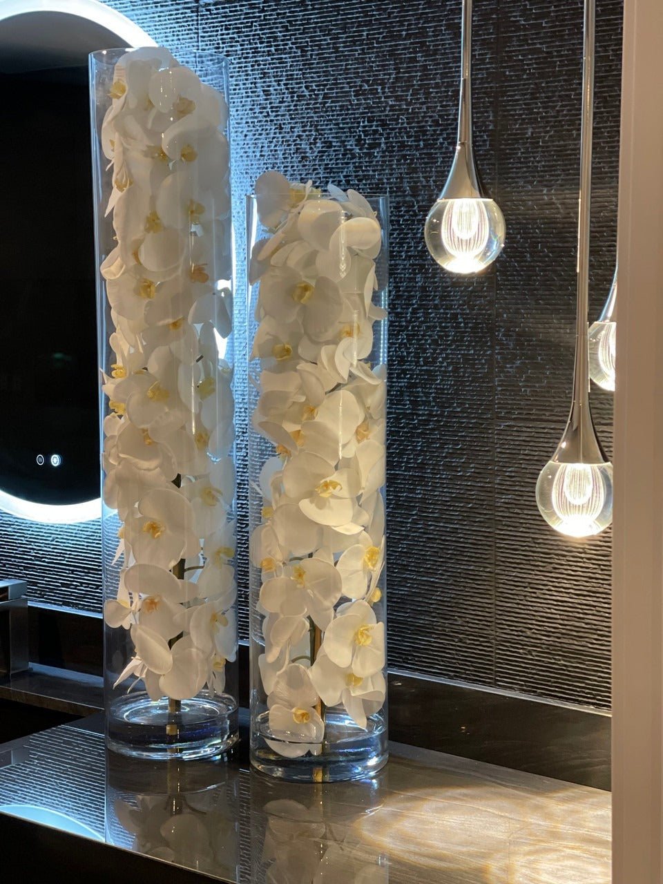 White phalaenopsis orchids anchored in Illusion water- completely contained inside a glass cylinder for a modern and sophisticated look. Grouped in three different sizes (40. 32. and 28). paired or elegantly standing alone. the simplicity of this vase makes it perfect for any space and decor style.These white phalaenopsis orchids in cylinder vase are also great for any event. These vases are very versatile and can be used for any occasion. whether you are in need for an attractive centerpiece or a stunning and sophisticated home glass decor.Hand-blown crystal clear glass not machine made. Crafted with thick glass and a stable bottom for the perfect table centerpiece.