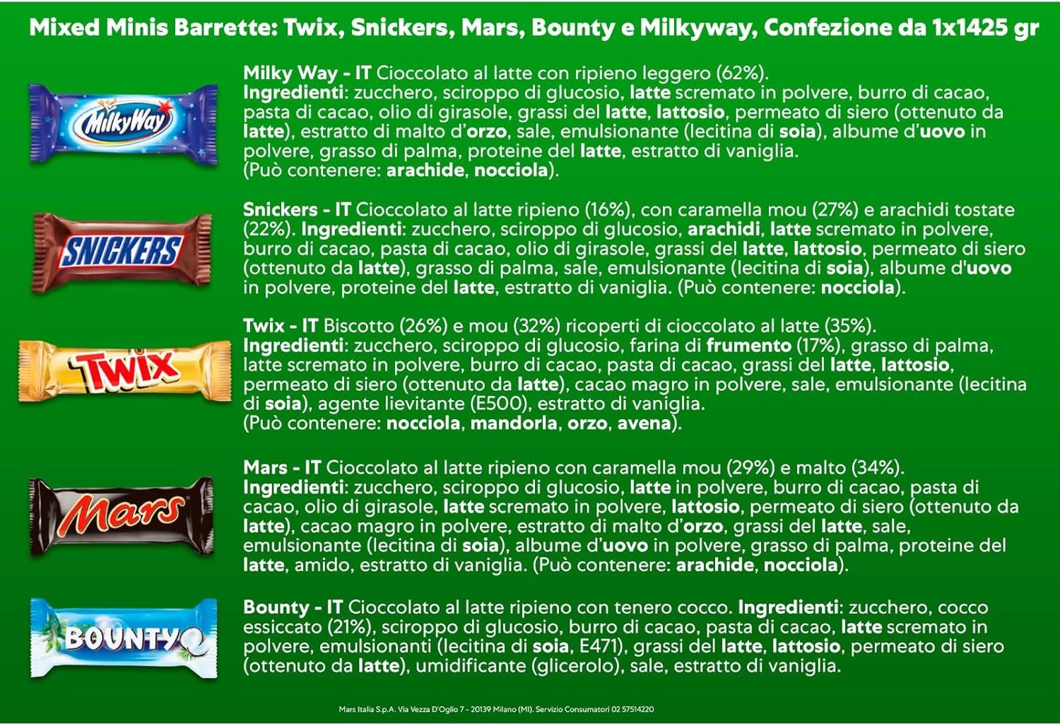 • Mars: Sugar. Glucose Syrup. Cocoa Butter. Full Cream Milk Powder. Cocoa Mass. Sunflower Oil. Skimmed Milk Powder. Lactose. Whey Powder (from Milk). Fat Reduced Cocoa. Milk Fat. Barley Malt Extract. Salt. Emulsifier (Soya Lecithin). Egg White Powder. Palm Fat. Milk Protein. Natural Vanilla Extract. Milk Chocolate contains Milk Solids 14% minimum