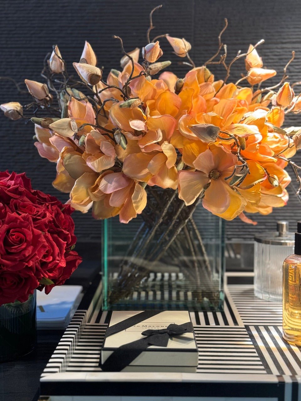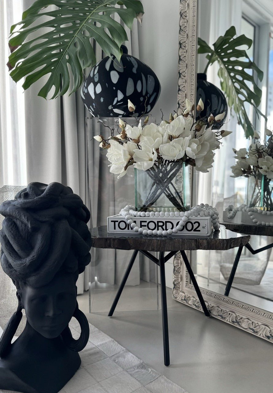 Square Casa Moderna glass planter with multiple stems of peach OR white magnolia blossoms. foliage and sand blasted grape wood anchored in our illusion water. Enjoy beautiful. lifelike magnolia tree branches that won’t fade after spring awakens. Displayed here in a stylish clear glass planter. magnolia flowers are cheerful and elegant in any season. Each hand-placed blossom and leaf is crafted with vivid color and exceptional detail. a tribute to Mother Nature’s artistry. Showcase this lovely faux tree on your dining table or living room tabletop.